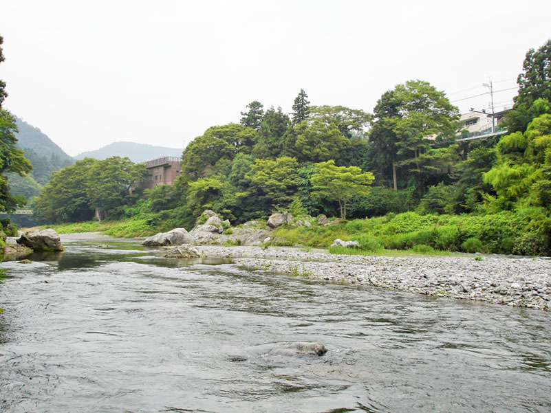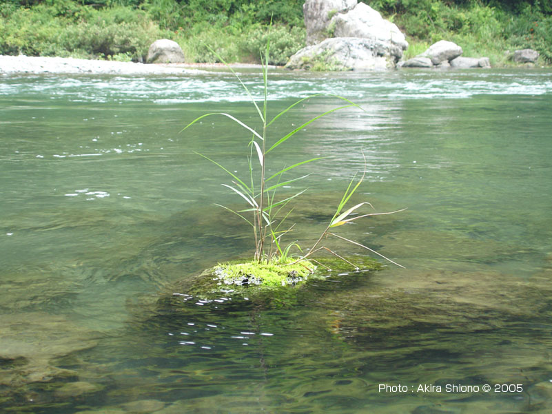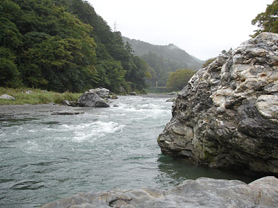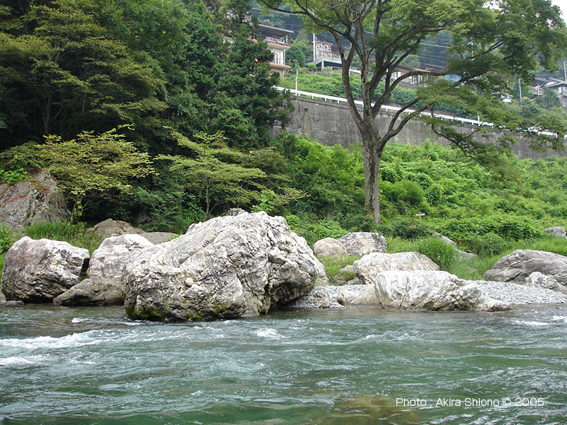 この頃気温が上がって来たせいか遊歩道を歩く数人の人が見えた。もうすぐポイントが無くなる位置までだなぁと思いながら竿を振ると、根掛かりしたように目印が止まった。一応念のために合わせると動かない。やっぱり根掛かりだ!・・・と思ったら、目印が動きだした。「あれ〜!ゴミかなぁ〜」と思ったら動き出した。「あれ〜魚じゃな〜い!」尺迄だったら少しすると顔が出るのだが、川底を這い回る感じで動きだした。ちょうどこの辺りは大岩があって流れが速くなっている箇所がいくつもある。この事が脳裏をよぎった。まさかと思っていたら全く弱る気配がない。川井のモンスターと違って対岸には走らなかったので運が良かった。なんせ水中糸は02である。何回も感じるがこの竿本当に細糸を守ってくれる。何回も突っ込まれ首をガンガン振られているのが竿から伝わってくる。少ない経験ではあるがその後どうなるか想像がつくから、向こうまかせで顔が出るのを待つ事にした。しかし、なんだか様子が違うのが数分相手をしていたら解った。結局落ち込みを越え下流へ移動をした。しかしまだ弱らない。一瞬魚体が水面に出た。茶色かったので「大イワナだ!」と思ってしまった。なんとまだ下流へ行こうとしている。これは02の水中糸が切れるという思いが脳裏を過る。