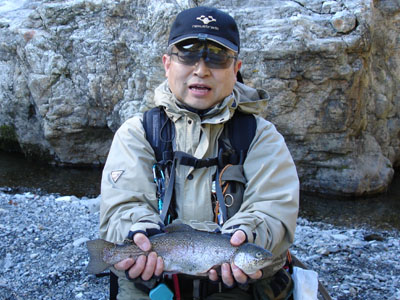 最初は寒いからと思っていたが、大岩の下から10cm位のチビヤマメが出たり入ったりしているが鈎には食い付かない。下流から来た釣師はやはりアタリも無いようだ。結局アタリも無ので、連れよりもどんどん釣り下がって行く。今迄出たポイントもアタリが無い。様々なポイントを攻めたが全くダメで、チビヤマメも釣れなかった。