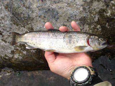けれども鯉はイクラは喰わないだろうと思ったが、これじゃ本命の「ヤマメ」も掛かりそうも無いので、水中糸を0.35号に落とすことにした。その後すぐに17cmくらいのヤマメが掛かった。ポイントをどんどん変えてキャストすると、目印に変化があった。すかさず合わせると鈎にのった。少し引いたが本流竿の胴で引き抜いた。手元に来たのは稚魚放流の21cmの綺麗なヤマメだった。この瞬間やっぱり来て良かったと思った。その後アタリが全くなくなったので、下流に移動するが、チビのアタリらしい物があり、ハリ掛りしないのでまた移動する事にした。