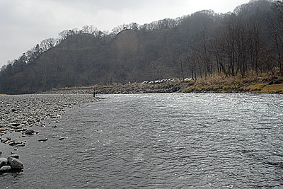 日 時:H20.3.25 出発/AM9:40〜PM11:50 御岳のアタリが停まってしまったので、どこへ行こうかと考えた後前回川井の次に向かったこの場を選んだ。駐車場と川の途中のグランドでは、シニアのグループがゴムバンドで飛ばす紙飛行機をやっていた。老人が紙飛行機のフックにゴムを引っ掛け、強く引き話すと矢のように凄い勢いで空の中に吸い込まれた。途中の小高くなっている堤を越えると一面に大きな石がびっしりと敷き詰められている河原が広がる。川の流れに沿って目をやると、所々に釣り人が見えた。 前回のポイントにはネオプレーンの上下決まった老人の釣り師が居たのでまずは上流に入る事にした。仕方が無いので上流から攻める事にした。しかし全く反応が無い。どんどん釣り下がっていく。気が付くと先程の釣り師の10m位上まで来てしまっていた。しかしその人は私が来てから1本も釣れていない。その内に、だいぶ前から来ていたのだろうか竿を畳み始めた。気が付くと帰ってしまったので、そのアタリに入る事にした。この辺りは落差が激しいのか荒瀬になっている。前回は035で無理をして切られてしまったので、めったに使わない05号を7.5mの竿に付けてある。シラミつぶしにポイントに流すと、ひったくるように目印が持っていかれた。合わせると流れが物凄く強いので凄い重荷が竿に伝わってくる。かなり竿が撓って半月のように曲る。05でも強引に寄せると切れてしまうので10m位移動すると、やっと顔が出たので糸を信頼して竿の撓りで引き寄せた。道理で引くわけだ28cmのニジマスだった。その後この中のゆるみがあるところを攻めると、またアタリが来た。 |