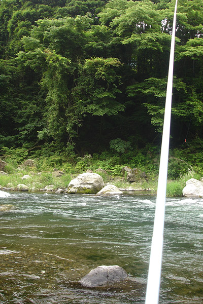 最初は御岳発電所当たりにしようかと考えたが、写真は軍畑のほうが向いていると考え車を寒山寺駐車場へ入れる。朝早かったせいか街道に近い方の日中日陰になる場所が3台程度空いていたのでそこへ入れる。近道の急坂を降りると途中開けたあたりで楓橋場見えるが、降りるに従って鮎師が数に見えてきた。橋を渡りながら下流の方が人が少なそうだと判断する。大岩の所で竿を伸ばす少し上には鮎師が瀬を攻めている。数回流すと反応があったが鈎に掛からず、やっとのこと掛かったのが12cm位のヤマメ。そのうちに中型のゴム製のカヌー?が近くに来た。まあ奥を通ってくれるだろうと思っていたら、乗っていたのは初心者らしく誤りながら目の前を通って行った。余りにひどいので「ざけんなよ!」と一発かましてやった。さすがに狭いポイントだったのでさすが諦めて下流へ移動した。