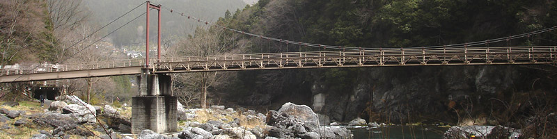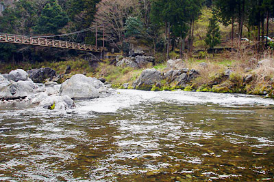 皆で「いもうとや」に続く坂道を下りながら川の様子を眺める。小橋下流の対岸に一人。手前には見えなかったので、連れに「手前側下流に行きます」と声をかけるとMさんが「人が見えたよ」と忠告してくれた。そこに近付くと入りたかったポイントに1人いた。様子を聞くとルアー、餌釣りの両刀で、餌で逃げ出したニジマスを1尾釣ったといっていた。ここに入れなければ釣果は無いと諦め、下流の岩盤の流れ込みに仕掛けを流すが、反応がない。正面で釣っていたIさんは既に下流に。Mさんも下流に行ってしまったので、仕掛けを竿に巻き付け対岸に移動した。