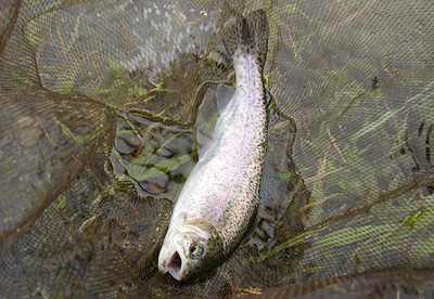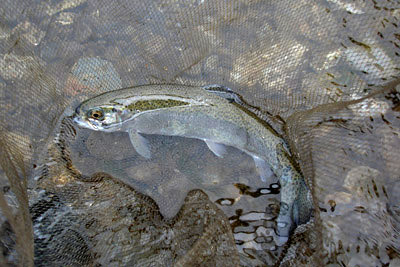 以前ここは対岸からではあるが、実績のある場所だ。しかしこちら側は下手をすると強い力で急流に行ってしまう可能性があるのが心配だ。岸からかなり離れて立ちこむ。かなり押しが強いので注意が必要だ。居そうな場所を狙って暫くしてやっと鈎にのった!・・・しかし全く寄ろうとしない。悪い事に強い押しでどんどん急流の方へ向かって行くでは無いか!糸切れしない様に急遽足場をどんどん下流に移動するが、水深がどんどん深くなって股まできてしまったが、どうにかなるだろうと深みに入り下流に回る。幸いテンションで運良く岸寄りの所に来ていてくれた。かなり引いたなぁと魚が見える位置までくると、なんと丸々と太った尺位のニジマスだった。かなり尾ビレ近くの鱗が取れているので恐らくOFCでキャッチ&リリースされたものだろうと判断した。もう少し小さかったらこんな事をしなくて済んで帰りがけのウェダーもぬれが少なくて済んだのにと思いながらお土産用に処理をして納竿した。しかし、釣り終えた頃には全く釣り人の姿は見えなかった。気候がもう少し快適になれば活性が上がるのだろうか?