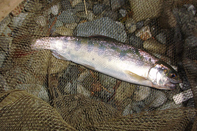 と考えながら流しているとなんだか、幽かな反応もう一度流すと喰ってきた!ニジマスより引きが穏やかだったので・・ヤマメ?と思っていたら水面に上がってきた。「〜やっぱり!」普通だったらやらないのだが、フロロの0.3だったので、一気に抜こうと竿を煽った時になんと!糸が切れてしまった。それも錘の上からだ!こんなこと始めてだよなぁ〜と思いながら糸を引っ張ってみるとプツプツきれるでは無いか、どうやら踏んでしまったか何かで糸に傷が付いてしまっていた様だ。トホホである。
