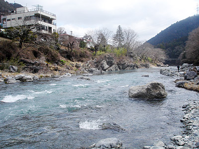 という事で、次の目的地は澤井にすることにした。設備補修でもするのか、資材で車3台分くらいが使われていたが難なく止められた。支度をしているとバイクがやって来た。最初は釣りかと思っていたが、大きな三脚を取り出し開いて置いた。支度を済ませ通りがかりにナンバーを見ると葛飾区!気温が氷点下近いのに良く出かけて来た物だと関心してしまった。恐らくヤマセミの魅力に取り付かれたのだろう。 慎重にポイントに近づき仕掛けをセットする。良っし!と振り込むと竿が後ろ方向に撓っている?・・・・なんと後ろのボサに1発目から引っ掛かってしまった。・・トホホである。気を取り直し竿を振る。やたらポイントを潰す様に満遍なく探るが、暫くしても当たりが無いので上流へ向かう。 この日は晴天でここ澤井は、川がちょうど東西に流れる場所になる。右岸を釣り上る私の右側から眩しいくらい日が差し、暖かく感じた。ふと鵜の瀬橋方向を見ると流れに青空が反射してあまり見られないくらいの絶景が広がった。澤井でこんな奇麗な景色を見たのは何時だったろう?などとふと思う。 |