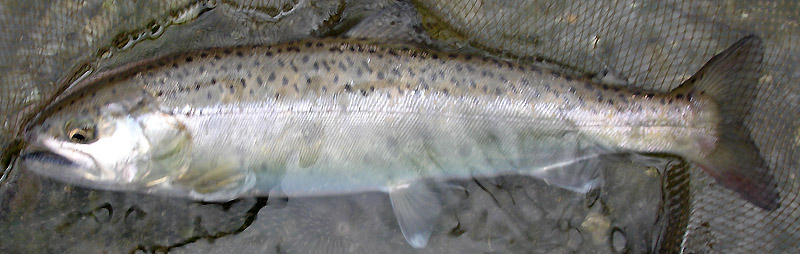 鵜の瀬橋まで蔦をかき分け進む。先ほど見かけた対岸の釣り師は私がかなり下流に居たときから、いまだに同じ場所で釣っている。チビをつり上げたのは目にしたけれど、魚籠を持っていた。あれから全く反応がないが、一応鵜の瀬橋まで行ってみることにした。居そうなポイントからは無反応で違った場所から1尾追加した。ここで一休みし朝食を鵜の瀬橋の下で戴くことにした。対岸には先ほどの魚籠の釣り師が上流側へ降りてきた。食事を終え少し上流へ移動するが無反応で、上流はさらに流れが強くなっているので諦めて元のポイントへ戻る。竿を振っていると何か突っ突いている感触が伝わる・・・・チビヤマメだった。沖側を流すと今度は本命のアタリがきた!左右に走ってなかなか面白い。やっと上がってきたのは27cmくらいのニジマスだった。 |