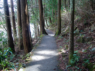 遊歩道を歩き、大岩の弛みがあるポイントに崖を降り竿を出すことにした。蜘蛛の巣が所々に張ってあるのでまだ釣り人は来ていないようだった。予想はしていたもののもともと悪い足場が増水でさらに悪くなっている。ボサも覆い被さり上にかなり気を使う。暫くしてやっと掛かったのはチビヤマメだったので、あっさりとこの場は諦め崖を上って遊歩道で上流に向かうことにした。 ドンドン釣り上がっていくと良さそうなポイントがあった。居るとしたらこの辺りだろうなぁとか考えながら竿を振っていると何かが突っ突いているのが竿に伝わってきた。チビでは無さそうだ。きっとまた喰ってくると執拗に竿を振る。するとやっとゴツゴツときた。しかし擦れているのか合わせたが掛からない。餌を取り替え再びポイントへ竿を振る。するとまた来たので、少し送り込んでから合わせるとやっと手応えのある振動が伝わる。 |