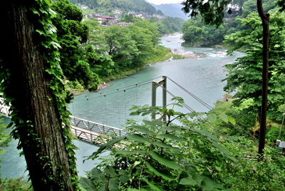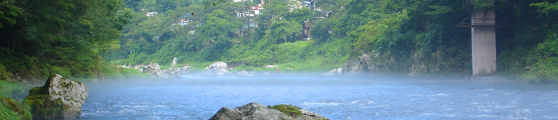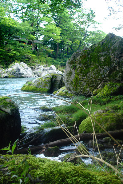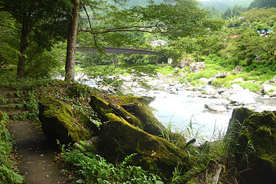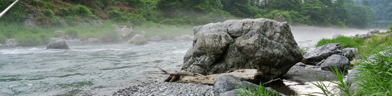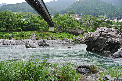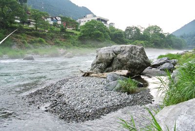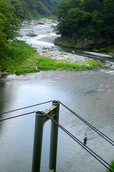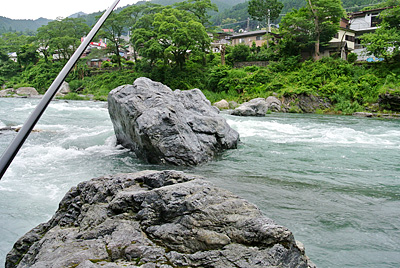 まだその周辺ににてまだ食いつくと思っていたので、満遍なく様々な箇所を探ってみる。目印に反応があり合わせてみると今度はしっかり掛かった。ちょうど水中に流れてきた大きなゴミ袋が掛かったように重い。今回仕掛けを替えたので安心して足場を有利な方へ移動もできた。 しかしなんだか今回は様子が違った。前々回御岳で運良く尺上イワナを2尾上げていたのだが、そのうちの大きい方の36cmは底を這い回って顔を出すまで数分かかった。しかしそれを上回るすごいパワーで左右に突進する。こちらはしばらくしたら顔が出るだろうと出来る限りテンションを限界迄掛ける事にした。少し竿が持ち上がってきたのでそろそろ出るだろう!と思った瞬間何と沖に向かって突っ込まれた!かなりテンションを掛けていたので、糸を切られてしまった。今迄はたいがいは025で尺上を上げているが、今回は得体が知れないサイズなので必ず上げようと、持っていた05に仕掛けを交換する。30分くらい居そうなところを流してみるが先ほどかなり暴れたので、警戒したのか全く反応がなくなってしまった。対岸で鮎釣りを休んでいる高齢者の方がファイトを見ていたのか、こちらが気になるようで連れと話しながら見ていたが、その後しばらく粘ったものの観客の期待には答えられなかった。 放水で水嵩が増え流れも強くなってきたので納竿した。その後鵜の瀬橋近く迄川の様子を見に行く事にした。直下の大岩の陰に30代位の渓流師がゆるみを狙っていた。今回はこの人のほかに楓橋下流に1人以外渓流釣りはいなかった。帰りがけに寒山寺の見晴し台から下流見ると軍畑の美しい巨岩の群れの手前に水遊びやレジャーを楽しむ人々が見えた。 |