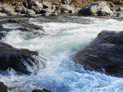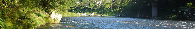 大きな岩が沢山あるかなり危険な場所を通りすぎ、鵜の瀬橋近く迄移動する。途中何か辺りのような物があったので、しつこく仕掛けを流したが、それっきりだった。鵜の瀬橋下迄きて、ポイントに流す物のここも無反応。いつもなら鵜の瀬橋を渡り対岸に移動して戻るのだが、今回はこちらの川の岸伝いにボサをかき分け、膝まで水に浸かり開けた所まで出る。ふと対岸にめをやると初めての釣り人を発見!ご夫婦の様だった。あちらもどうもつれない雰囲気が漂っている。しばらくして諦めたようで、下流へ行ってしまった。 |