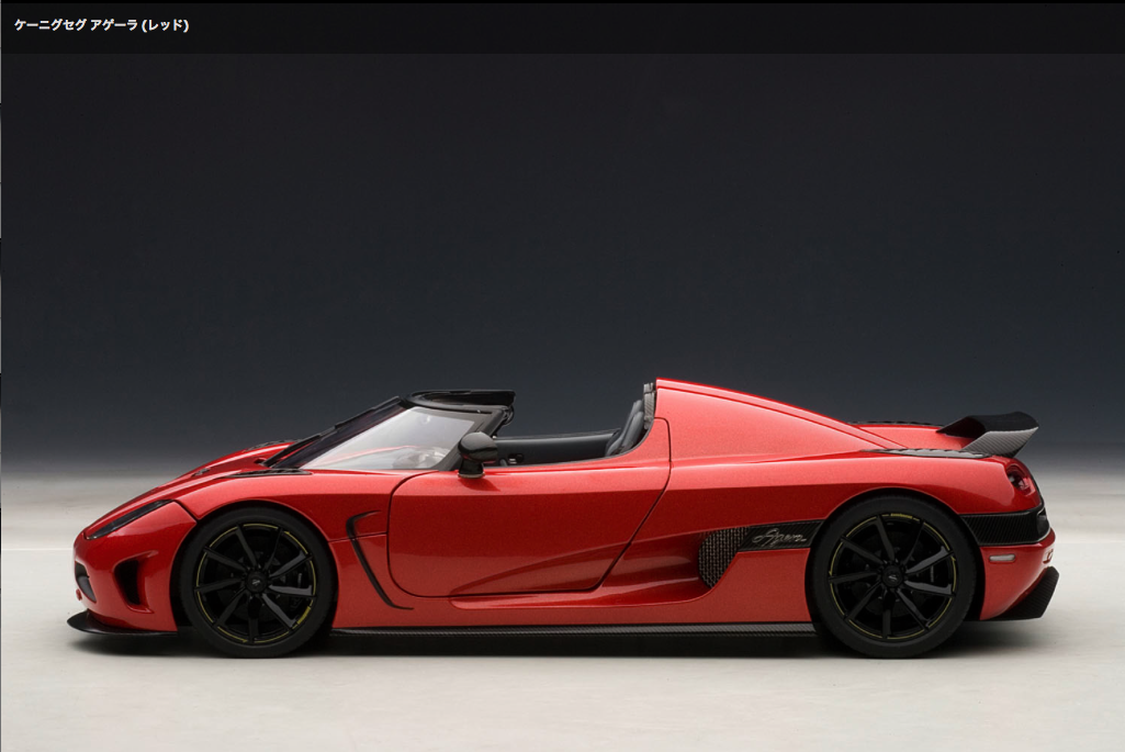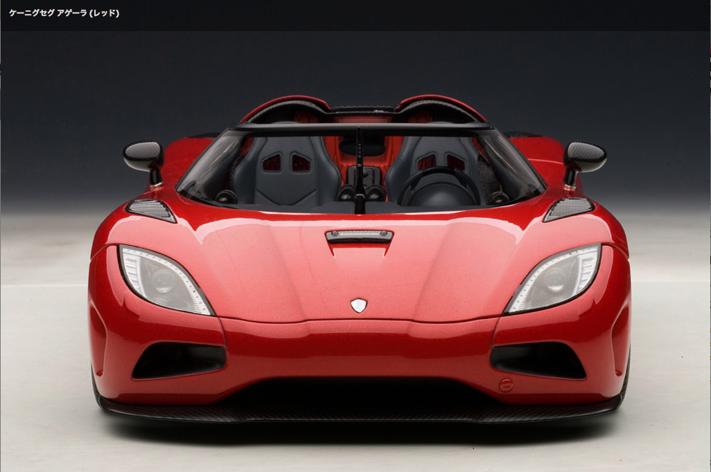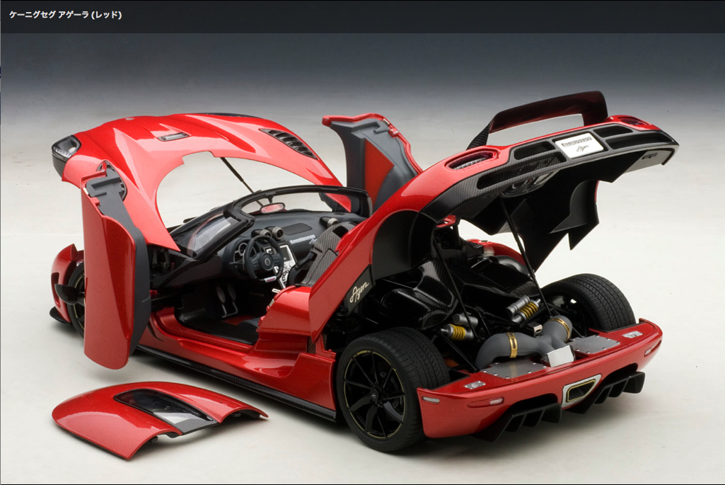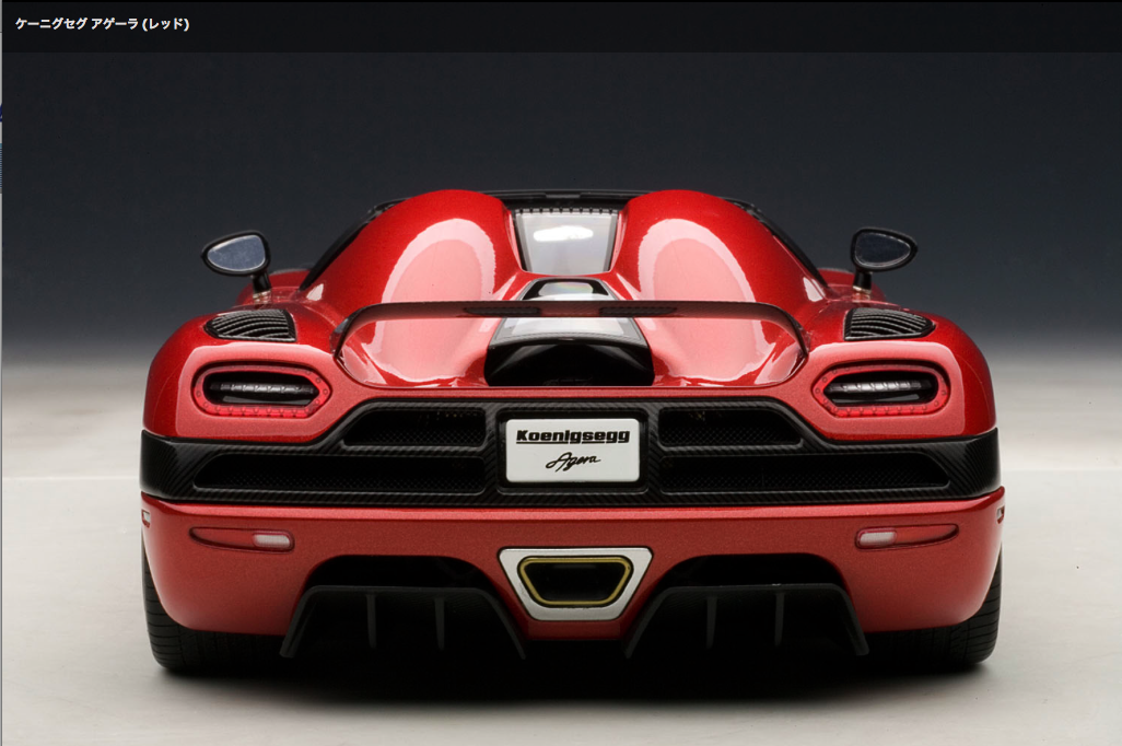 Auto art 1/18 MinCar ※オートアート製品は一定数生産され販売されますと、入手が困難になります。ご購入予定の方はご注意ください。 ![]() 2010年のジュネーブショーで発表された『ケーニグセグ アゲーラ』は、アルミやカーボンファイバーを多用した軽量なボディのミッドシップに最高出力940PSの5リッターV8ツインターボエンジンを搭載。0-100km/h加速3.1秒、最高速395km/hオーバーという驚異的なパフォーマンスを発揮します。オートアートでは、空力性能を追求したエクステリアデザイン、個性的な開き方をするドアや着脱式ルーフ、レースカーさながらの複雑なエンジンルームなどスウェーデン製スーパーカーの魅力を余すところなく再現しました。 (写真・記事:AUTOart 商品サイトより)※AUTOartサイトでケーニグセグ アゲーラをさらに見る