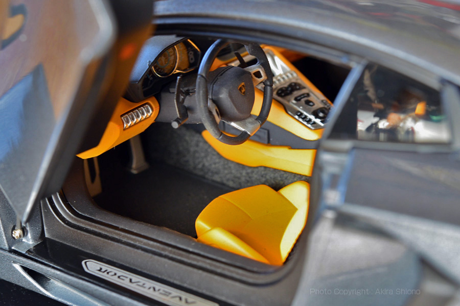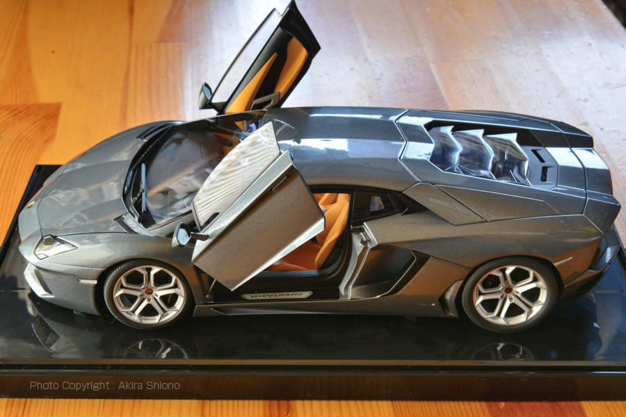 エクゾストはセンターしたにまとめられています。リアスポイラーは可動式です。 ![]() エンジンフード、労側のドアを開いた状態です。 ![]() 左側から両側のドアを開いた状態です。ドアの上がり方もダンパーが効いているように上がります。 ![]() 左側のドアを跳ね上げた運転席の画像で1/18はかなり精巧に作られています.