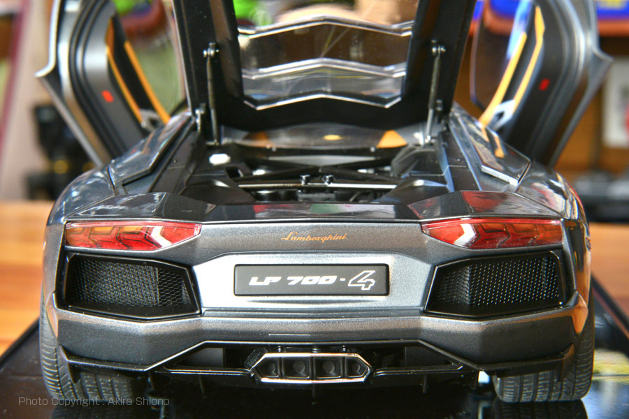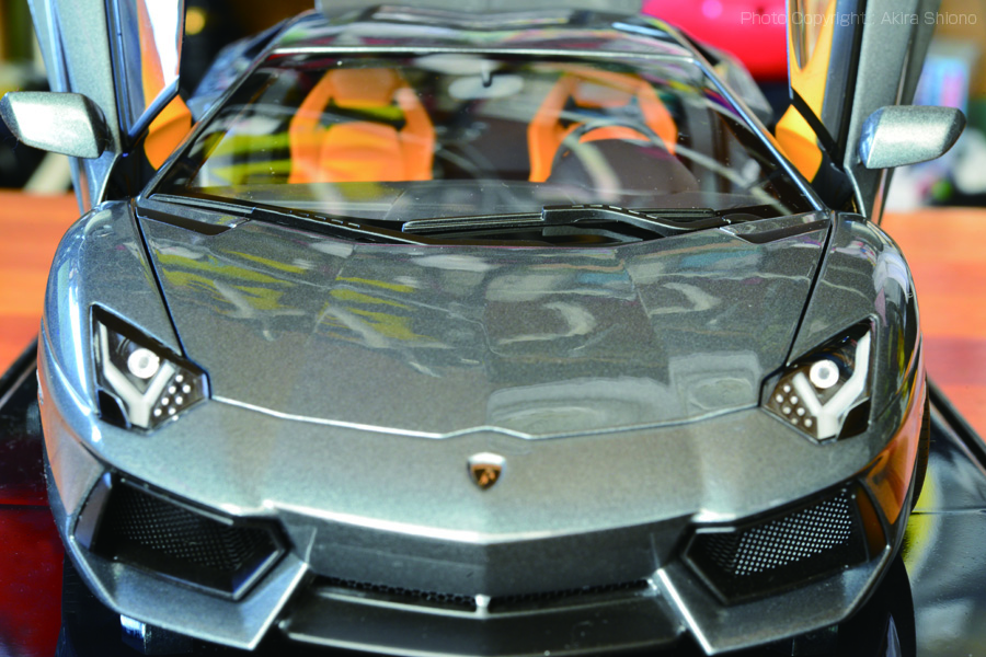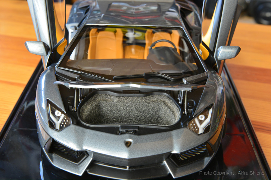 サイズは全長4,780mm、全幅は3ナンバーが始まる1,700mmを遥かに越える2,030mm、全高は1,136mmと大人の胸くらいと低くなっています。 ![]() ランボルギーニ LP700-4のフロントビュー オレンジ色のシートがアクセントになっています。 ![]() リアエンジンのため、トランクスペースはボンネットにあります。可動部分もよく作られています。