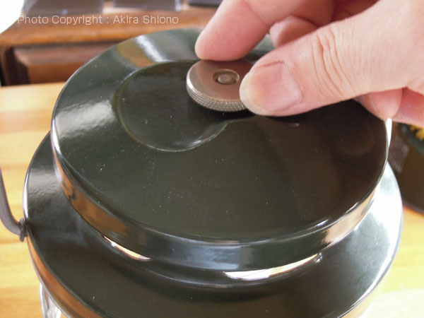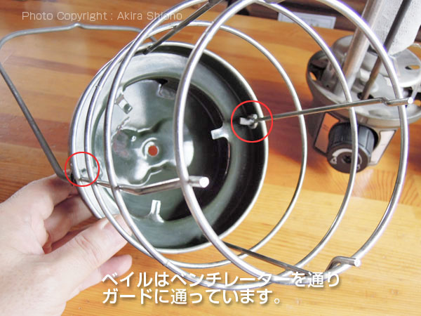 このタイプとホワイトガソリン用のNorthStar2000は、ベンチレーターナットを緩めると、ベンチレーター、ガード、グローブ、ベイルが一体となって外せます。アウトドアでも非常にメンテナンスがやりやすく考えられています。 一体型の上部を分解する トップへ