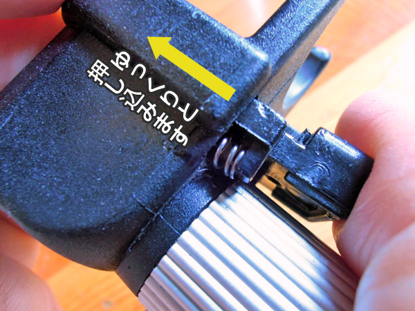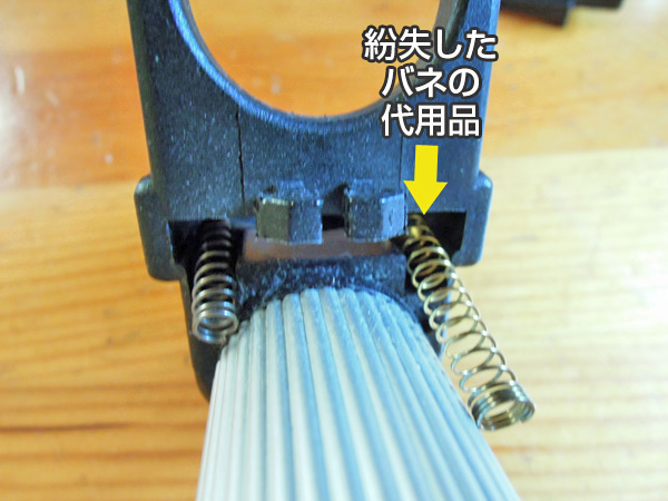 後に、構造と原因、そしてお金をかけずに修理する方法をご案内いたします。 ロック部品の欠損と補充 トップへ これがスリムキャプテンチェアーのアームレストを前のポールにロックするパーツです。このパーツはアームレストと前脚の差し込み部分に使われて固定する役目の部品です。この部品は通常はアームレスト端の黒い樹脂部分に収まっています。いつの間にか片側の差し込みロックが効かなくなっていました。この部品は、左の画像の様なパーツです。2本のバネが差し込んだ前脚をロックする構造になっています。 このバネのうちの1つが恐らく気が付かぬ間に無くなっていました。部品自体の供給はない可能性がありますので、他の部品(廃物品)を利用をします。 欠損に気付くまで、しばらくは片側だけで止まっていましたが、斜めになっていて外れ易くなっていました。椅子を組立てた時に部品の止め部分が開いていてバネが飛び出しました。 恐らくこの小さなバネの部品は手は手に入らないと思いましたので、インク切れのノック式のボールペンからバネを取り外してみました。写真でお分かりの通り、バネの金属線の太さが全く違っています。恐らく同じ長さでは弱いと判断して、長いまま使用し縮めて使うことにしました。 構造と部品と組み立て トップへ