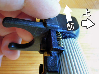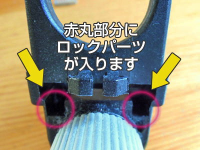 ロックパーツの構造は、上段の写真ようになっています。上のパーツがパイプ上の溝に入るようになっています。この更に下にある溝は、スプリングが入るようになっています。右の写真はその部分にオリジナルのスプリングとノック式ボールペンに使われていたスプリングを差し込んた状態です。