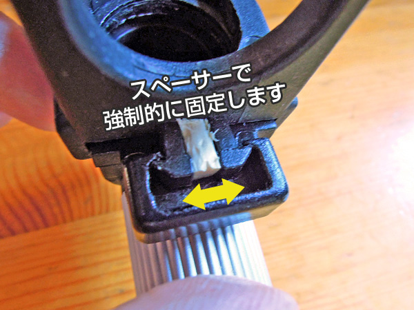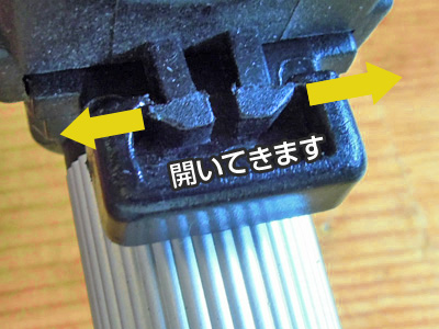 左の写真が、差し込み終わった状態です。問題はこの部品の鈎型(かぎがた)の部分です。しばらく使い続けていると、この開いている箇所が段々潰れてきて引っ掛かりが弱くなるようです。使用中にこのようにならないように、部品を追加します。部品の素材は、ある程度弾力があって、外れないだけの摩擦があることです。この箇所に穴をあけたりすると強度が弱くなるので、開き止めを差し込むだけにしました。 移 動: 故障と現象 ロック部品の欠損と補充 構造と部品と組み立て リンク: ホワイトガソリングッズ 夜のアウトドア・グッズ ナイスなグッズ キャプテンチェアーの修理 ガソリンランタン ガソリンストーブ 便利なLPガス機器 地面に合わせたペグ選び