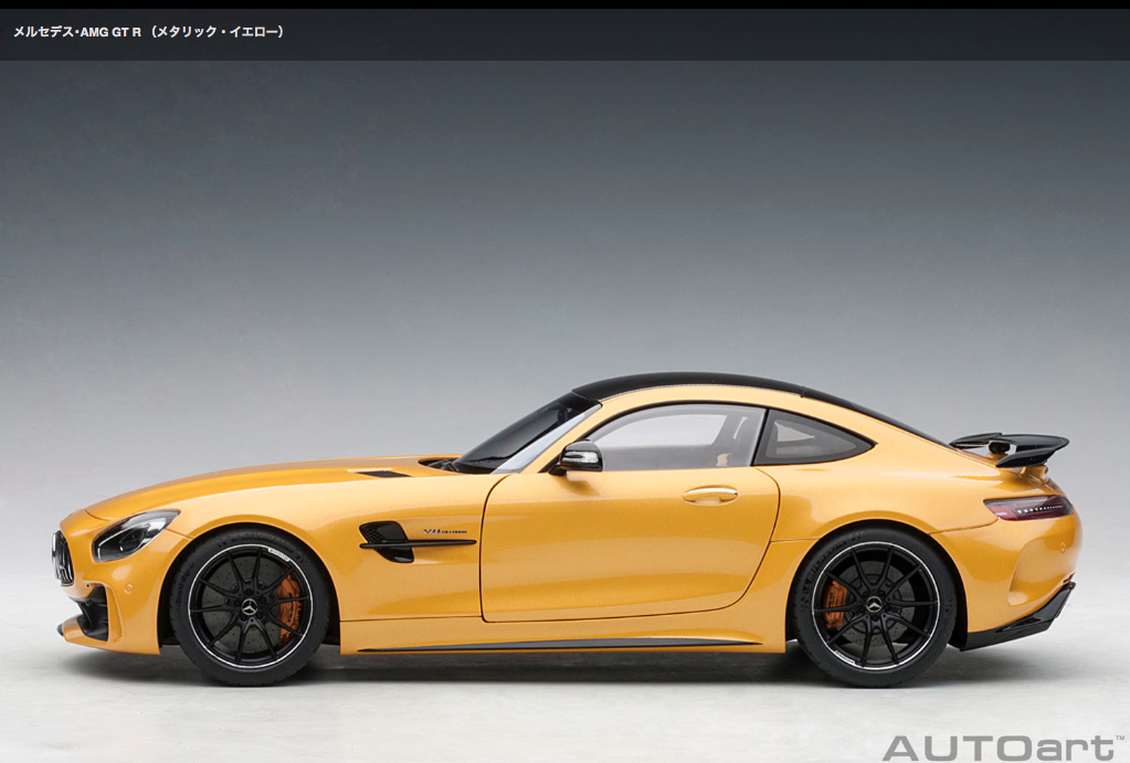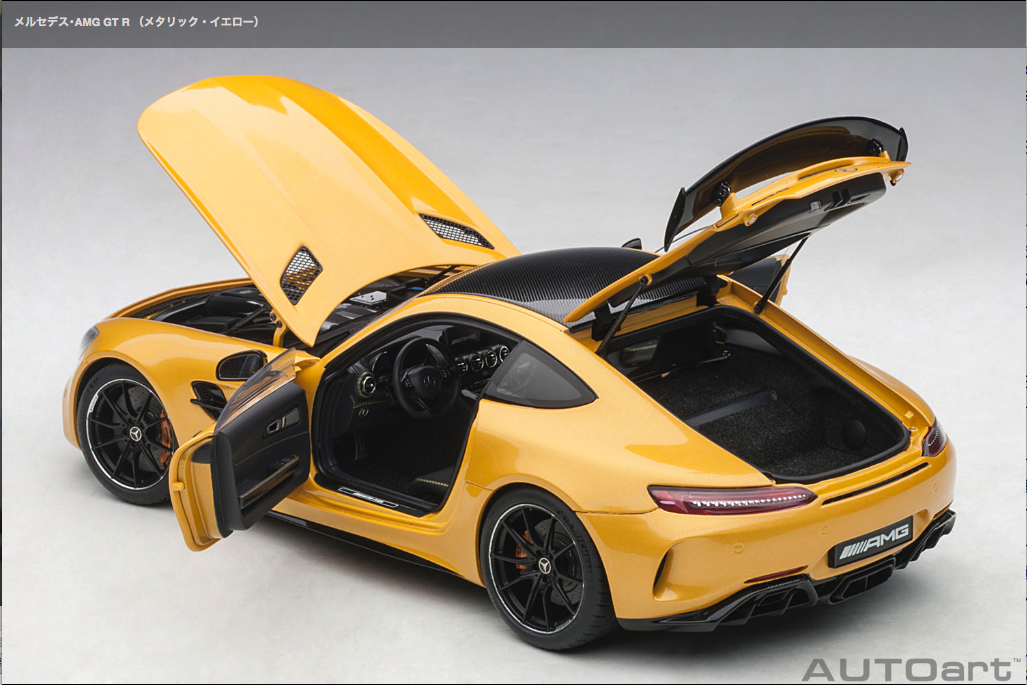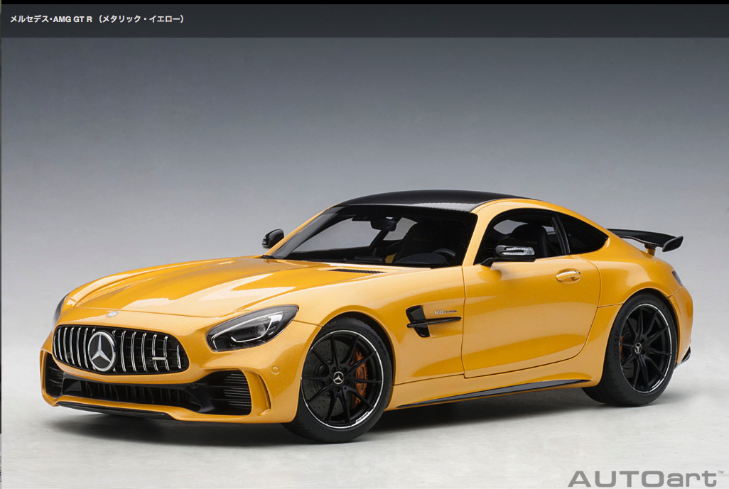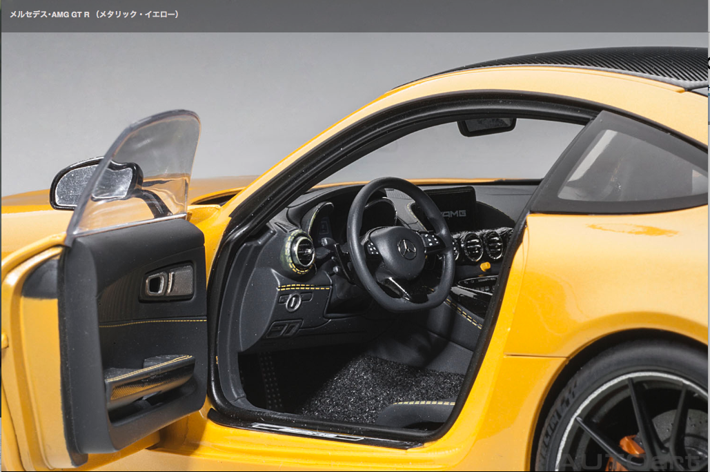 Auto art 1/18 MinCar ![]() メルセデス・AMG GT R (メタリック・イエロー) 2017年6月の「グッドウッド・フェスティバル・オブ・スピード」で発表された『メルセデス・AMG GT R』は、究極のハイパフォーマンスを追求する「メルセデス・AMG」が「オンロードレーシングカー」をコンセプトに開発しました。ベースとなるのは、軽量で高剛性のアルミ製スペースフレームと前後重量配分に優れるトランスアクスルレイアウトのFR方式を採用する「メルセデス・AMG GT」。それにアクティブエアロダイナミクスやトラクションコントロール、「メルセデス・AMG」としては初採用となる4WSなど、サーキット走行のための専用デバイスを装備し、高性能スポーツモデルの聖地として名高い「ニュルブルクリンク・サーキット」でのテスト走行を繰り返し鍛え上げました。ハイスペックモデルである「GT S」より更に75psもアップとなる最高出力585psの4リッターV型8気筒ツインターボエンジンが搭載され、0-100km/h加速3.6秒、最高速度318km/hを記録します。オートアートでは、迫力のワイドボディやかつてのレーシングカー「300 SL」を彷彿とさせる「AMG パナメリカーナグリル」も忠実に再現。可動式リアウイングやディフューザー、フロント19・リア20インチの専用鍛造アルミホイール、サーキット走行に対応するミシュラン・スポーツタイヤ、インテリアのアクセントとなるイエローのシートベルトやステッチなど細部までリアルにモデル化しました。全4色。 (写真・記事:AUTOart 商品サイトより)※AUTOartサイトで見る ディーラーで実車を見る