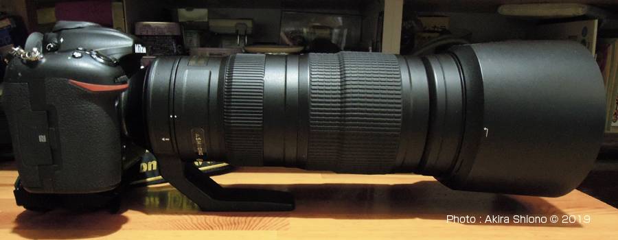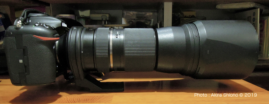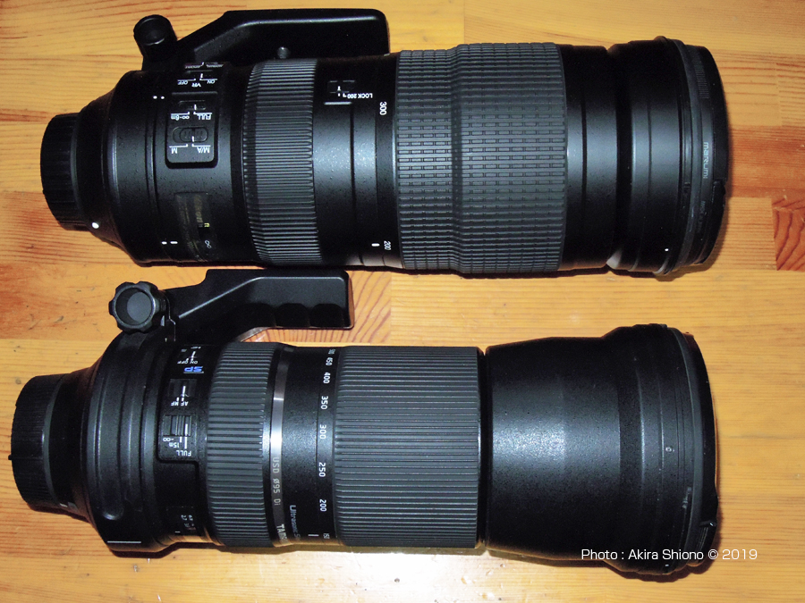 上の写真の上段はニコンD500にNIKKOR 200-500mm f5.6E ED VRにフードを装着した状態です。その下は、同じニコンD500にタムロンの150-600mm(A011)を装着してフードを付けたものです。