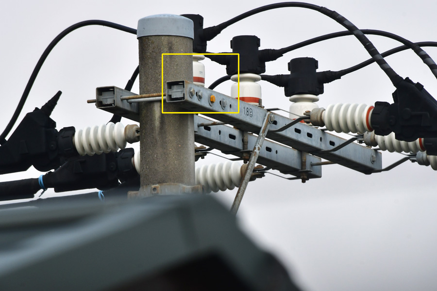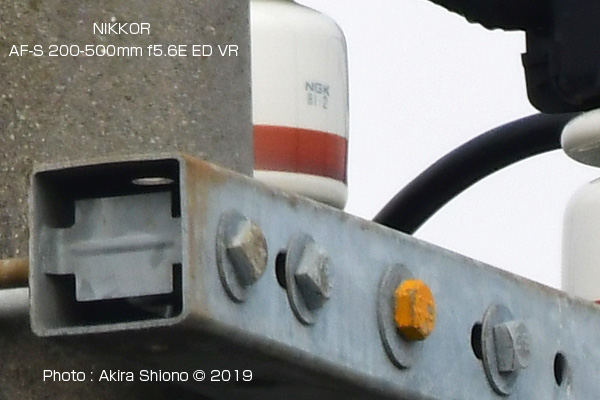 左側の標準画像ではほぼ違いがわかりませんが、アップ画像を比べてみますと、タムロンはエッジ部分が滲んでわずかに偽色が出ています。赤い帯の入ってガイシに描かれている「NGK 81-2」の文字と電柱のコンクリートの素材が、ニコンの方が粒立って見えていますが、タムロンA011は滲んで見えます。