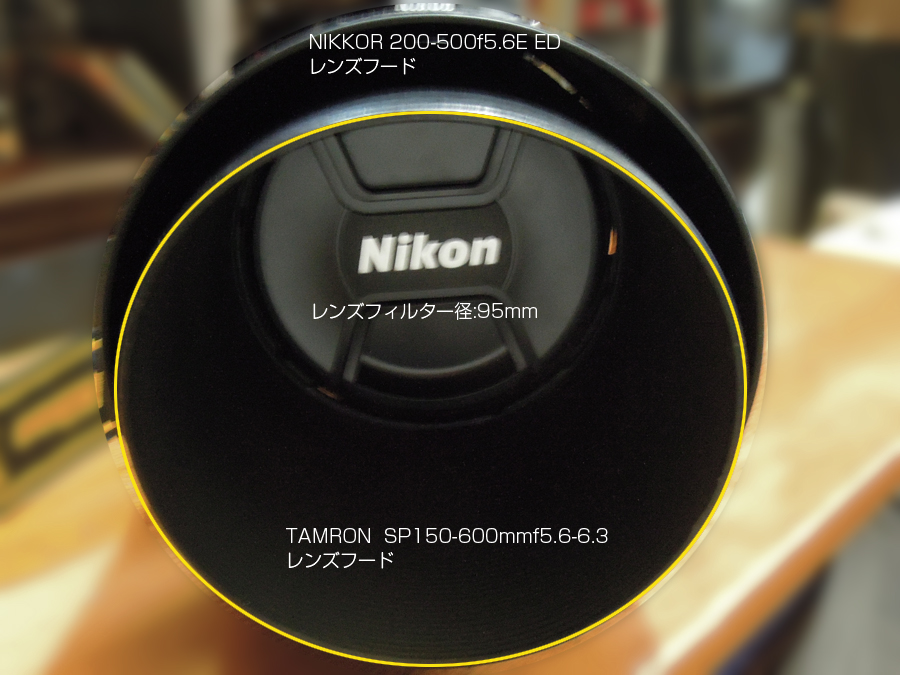 右の画像はニコンの200-500mmレンズのフード部分にタムロンの150-600mm(A011)のフードと入れてみた写真です。フィルター径はともに95mmですがニコンは広角側が狭いのに関わらず、かなり大きくすっぽり入ってしまいました。