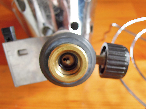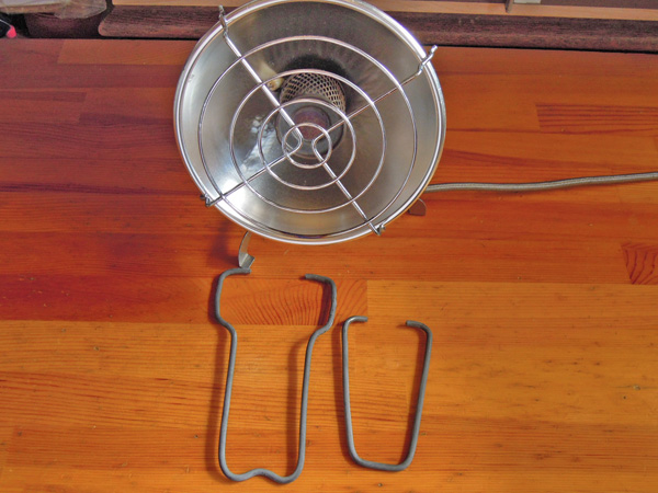 クイックヒーターの元にあるコーンの部分には空気取り入れの穴が数カ所あいています。ここを利用して、太めの番線で下の写真の部品をつくってみました。左は前転防止スタンドで、右は本体が加熱して持てない時に使う持ち手になります。