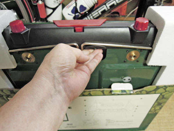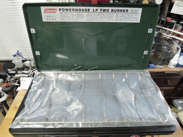 このツーバーナーは、初代のコールマンパワーハウスLPツーバナーです。非常に薄く造られていて持ち運びがとてもラクです。ちなみにサイズは、使用時では幅約63cmx奥行き33.5cmx高さ53cm(フード設置) 収納時のサイズは、横約53.7cmx奥行き32cmx高さ5.5cmです。重量は約4.1kgでバッグに入れれ歯自転車でも運べる大きさです。 天板の汁受け部はフッ素樹脂加工で汚れが付きにくくなっています。 コールマンパワーハウスLPツーバナーの組み立て 自動車などで運搬する場合は箱に入れておくと傷もつきにくく収納もグッドです。下の写真二ある様に、箱の中には本体をホールドしてくれる、発泡スチロールのガードがあるので、全く動きません。保存しておきたいのは、この箱一式と五徳を入れる厚手のビニール袋です。これがあると本体内部に傷が付きにくくなります。 風よけプレート・ガスカートリッジを取付ます トップへ