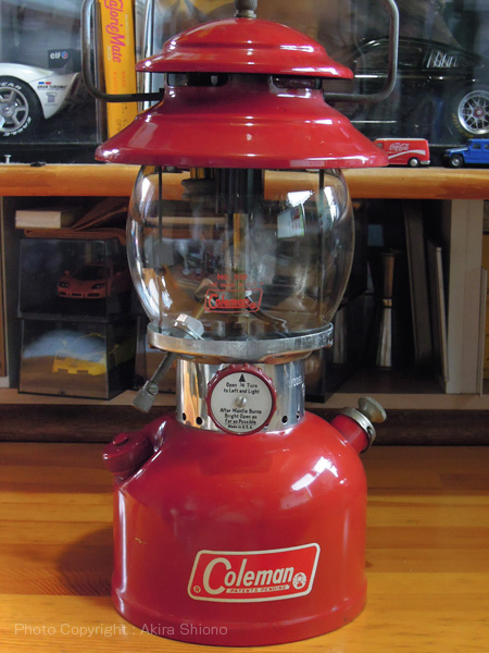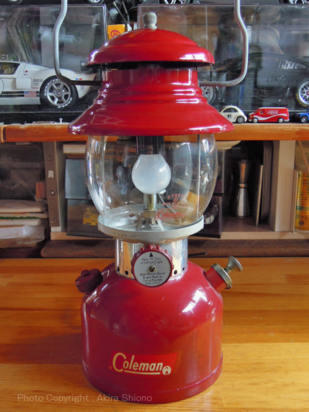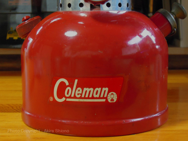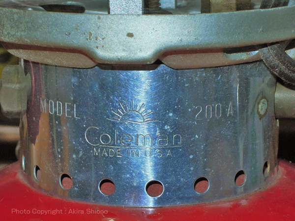 アメリカ製の200Aは、製造された年代によって、カーラーとフレームが黒いものや、赤ベンチレータと緑タンクのものや、カナダ製でご紹介しました、メッキタンクのものがあります。また、製造の年代により、全体の色が朱赤に近い赤、バーガンディー、ディープレッド、グリーンの物もありました。 U.S.A Coleman Model 200A 1958.4 トップへ