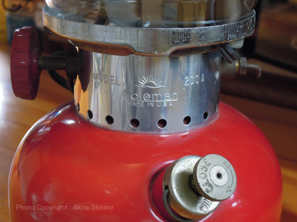 左の写真のものです。今までの200Aと違うところは、アルミカーラーに使用説明の英文が印刷されています。また、バルブホイールは今までの濃い赤から、黒へと代わりはホイールを止めるビスが黒になっています。コールマンのランタンの代名詞であった、タンクキャップがこの辺りからビス無しになっています。フレームも以前より綺麗にプレスされています。