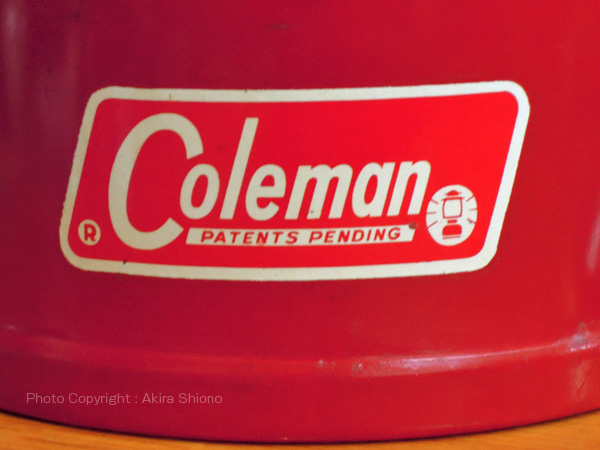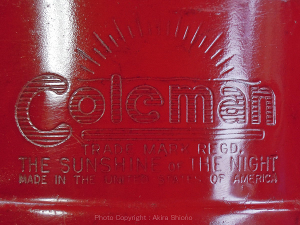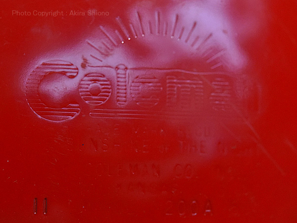 U.S.A Coleman Model 200A 1962.11 トップへ ![]() 1960年代には深い赤(紅)色のバーガンディーが販売されました。この固体は「ディープレッド」と呼ばれるタイプです。 タンクのロゴは白い縁なしで濃い赤のタンクに赤いラベルがわずかに浮き立っています。そのせいかColemanの白文字は伸び伸びしているように見えます。この頃のランタンは塗装が悪い物が多いようで、この固体も塗りムラがあります。 ColemanDualFuel この時代のデザイン刻印は220Fなどはタンクの底にされていましたが、このU.S.A Coleman 200Aではデカールの真裏のレバーの下側のタンクに深く刻まれています。カーラーには、これよりも新しいコールマンのロゴが刻印されていますが、レトロなデザイン文字とTHE SUNSHINE OF THE NITEという文字はありません。この日の出のデザイン は1956年3月製造のカナダ製の200のグローブに見る事が出来ます。 U.S.A Coleman Model 200A 1966.11 トップへ ![]() 1960年代の後半に向っては、タンクに貼られたデカールに「PATENS PENDING」の文字が入っています。 SeasonLantan