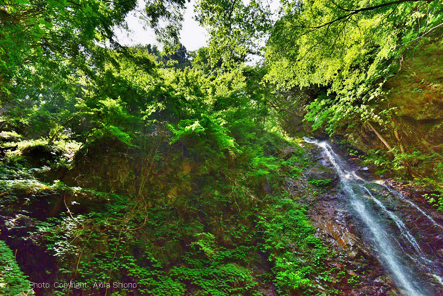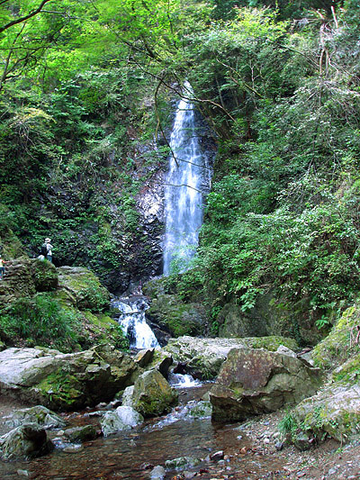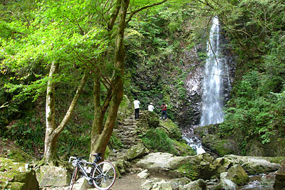 懐かしい風景が見えて来ました。払沢の滝のバス停の所で撮った写真が右上にあります。その大きく右に曲がるカーブの正面の上り坂が払沢の滝の入口になります。少し進んだ看板を良く見ると、橋の手前を左折と書いてあります。その通りに進むと10年前に見たことがある景色が広がりました。上り坂の途中には喫茶店の様な茶屋があります。少し進むと左側は深い谷になっていて数十メータ下には流れが見えます。ここ辺からは砂利…といっても岩が割れて尖った石が散らばっていますので乗車して進むのは危険です。仕方が無いので自転車を押して林道を進む事にします。所々タイヤが岩で跳ねるので、前輪を持ち上げながら押して進むとやっと滝が見えて来ました。 帰りは暫く下り坂 トップへ