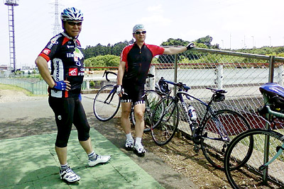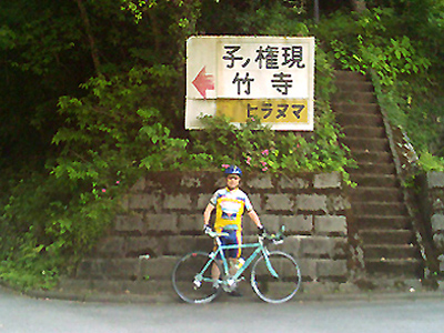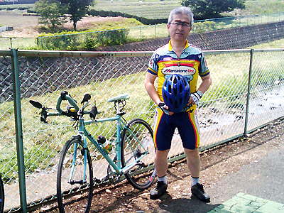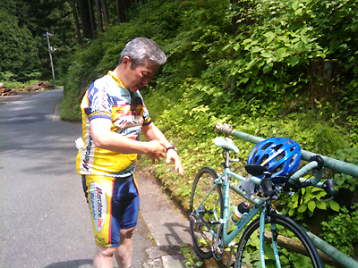 ツーリングPart2 日曜日は久々起きられたらに釣りにでも行こうかと床に着きました。少しして携帯電話が鳴る。出てみると自転車好きのSさん。明朝10時半いつもの場所で集合とのこと。この前カンパのZONDA 3Gの軽量ホィールやリアスプロケットを交換したので、試走にちょうどいいと承諾しました。出発前に軽量化と入念な整備 前回は、ドライブトレインのメンテナンスをやっていなかたので今回は十年来の埃が溜まっていたのものを清掃し、給油しておいた。また前回の反省点として、ペダル関係をいい加減にしていたので、今回はSPDシューズに合うSPDビンディングに交換する。また、幾分でも軽量化に貢献するので軽量のアルミスタンドも取り外す。今回はナビは装備せずに、代わりに気温が上がってきたので心拍数を把握出来る「パルスメータ」を取り付けました。早速状態を見ると、スイッチを押すと液晶が点滅して消えた。・・・暫く使っていなかったので電池切れしていた。幸い予備の電池を用意しておいたので、送信、受信側と両方交換すると復活しました。自治会の用を済ませ、出発準備に漕ぎ着ける。この日は気温が高くなりそうだったので、近所の目が気になるが、彩度がきついスーツのみで出かける事にしました。 今回は前回よりもさらに遠く トップへ 言い出しっぺのH.Sさんは今回は名栗湖方面に行くといっていたが、往復で約100kmになるという。久々の長距離だが、今回は、自転車の気になっていたホイールを交換してあるので、どうにかなるだろう気楽に判断しました。10時半に狭山湖下の青梅街道と自転車道と交差する所が待ち合わせ場所です。相変わらず出発までドタバタしましたが、そこに時間までに間に合いました。しかし誰も集合場所には来ていなかったので木陰で一休み。派手な私の姿を私を見て、歩いていく老夫婦の奥さんの方が笑顔を返してくれました。私は髪がグレーになっているので「頑張るわね〜」と言っているように見えた。 目的地は子ノ権現 トップへ 少し経って今回のメンバー3名が揃って当初目的の名栗湖から子ノ権現方面へ目的地が変わった。村山貯水地までの坂道でクランクを交換して調整が誤っていたのか、チェーンが落ちてしまった。手で嵌めて貯水地でKさんに調整してもらう。どうにかなったが余り調子が良くない。今回この方面は2回目なので、やっと記憶に残った風景画出てきたので、少し安心感が出てきた。途中前回立ち寄ったコンビニで、今回は釣りの朝食と同じ種類を購入する。写真にあるような川の畔で草に腰を降ろし昼食にする。それを終え子ノ権現に向かって緩いそして長い勾配を上っていく。かなり走ると途中広い場所で運転手は見えたが乗客の見えないバスが止まっていた。そのあと道がどんどん細くなっていわゆる林道になっていく。結局は竹寺(観光名所らしい)方面に向かう事に。 続く坂道 トップへ 途中、ピナレロのH.Sさんが遅れて見えなくなっりました。スペシャライズドに乗った元気な自転車マンK.Sさんはどんどん上っていく。 良く回る軽量ホイールに感謝! トップへ
