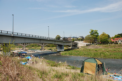 この先の道が分からず、陸奥橋通りに戻ろうかと考えていたらちょうど、2人連れのサイクリストが目の前を川沿いにある細い農道を走って行きました。私も後をついて行く事にしました。おかげで苦労をせずに山田大橋までの近道が出来ました。大橋手前(下流)の橋を渡り、以前下見に来た場所に来ると、広くなった河原には家族連れなどが見えてきました。
