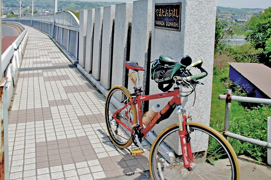 河原のバーベキュー広場では、子どものいたずらで、母親が大声で子供を叱っている声が聞こえました。そんな光景を見ながら少し休んで、ここは山田大橋のすぐ下の河原なのですが、大橋は遥か上にあるので、急勾配の坂を上らなければいけません。おまけに道路脇にはタイヤが道を削って上ったようで細かい砂利が溜まっているのが見えます。