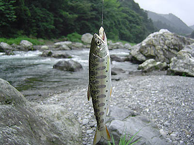 日 時:2003.7.20 出発/AM3:00〜PM9:50(川井へ) 軍畑は魚は釣れないがポイントはたくさんある。先週に引き続き釣り上りは餌で、釣り下りはルアーでやってみることにした。午前4時に準備をして河原へ行くことにした。といってもまだ降り口は真っ暗でヘッドランプを忘れてしまったので、階段の手すりを頼りに下まで降りる。手探りで餌をつけて振り込むが当然目印は見えない。しかしアタリが全くない・・・。かなり上までいってやっとヤマメのアタリが・・・しかし14cmしかなかった。腕が未熟なのか?あまりに釣れないので川虫を探す。やっとの事でピンチョロ1匹とクロカワの小さいのを見つけた。最初はクロカワをと振り込むとなんとアユ(写真とは別)が釣れたが足下でポトリと落ちてしまった。今度はピンチョロでと振り込んだら川藻に絡まって万事急須。ブドウ虫ではアタリが無い。 |