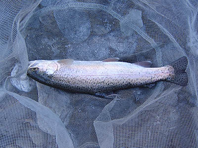 軍畑のヤマメは15cmまでだった。 ![]() ひれがピンクの体高のあるニジマス。とても美しい。