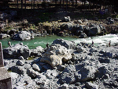 Mさんは早速朝食の支度に入ってしまったので私はひとりで先週のポイント、特に隣の人が「アマゴ」を釣り上げた所に竿を振るが水量がとんでもなく多く弛みは流れになってしまっている。思うようにアタリが全く出ない。パラパラいる釣り人を見ても釣れている気配がない。しょうがないので私もバーナーで鍋焼きうどんを食べる事にした。食事を終えて竿を出すがアタリの気配が全く無い。このへんは地元の人が毎朝来て根こそぎ釣ってしまうようだ。 河原に着くとMさんは何回か来ている場所だが今まで釣った事がないと云っていた。 |