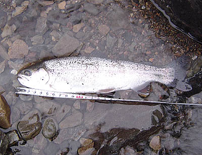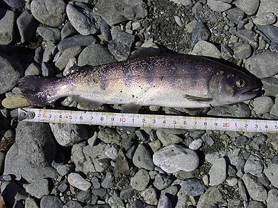 最初に釣り上げた25cmのニジマス。