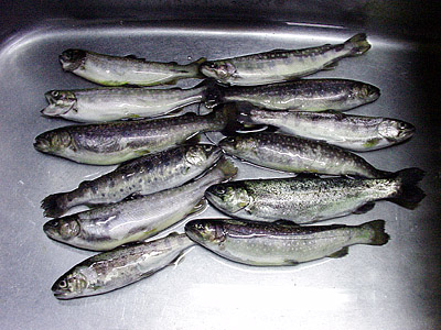 ![]() 釣り上げた23cmのイワナ。やはりムナビレが無くなっている。 ![]() この日の釣果12尾/ヤマメ2尾、イワナ9尾、ニジマス1尾