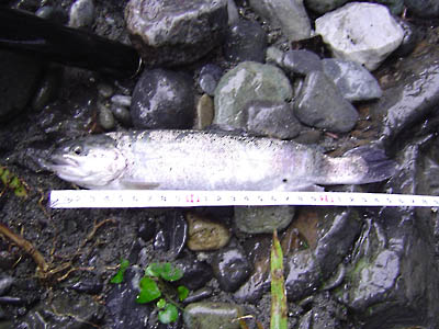 ![]() < AM9:35 濁りの中で釣れた細みのニジマス。