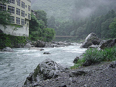 2003年の夏休みは雨で始まった。この年の夏は御岳へ行くと決めていた。今回は「いもうと屋」から釣り上がる事にする。無料駐車場に車を置き、支度をして河原へ向かう。久々の御岳であるが今までに見た事が無いくらい水量が多い。早速弛みに仕掛けを入れる。しばらくしてもアタリが無いので釣り上がる事にした。なんといっても濁りが泥を溶かした様な渓魚にとって視界がきかないような状態なので魚の鼻先へ餌がいかないと釣れないだろう。幸い巻き返しの所で目印が止まったので合わせると鈎に乗った。引きを楽しみながら引き寄せると25cm位のニジマスだった。