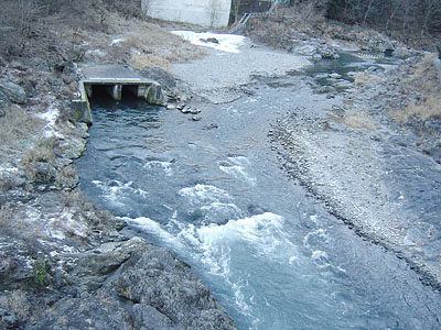 Iさん、Mさんとパッとしなかった川井を後に発電所へ向かった。相変わらず発電所排水溝の上から約70cm位の所まで濁り水がきていた。川井からの移動で脱走ニジマスを追ってここへ来た物の釣り人が昨日より少ない。手前は恐らくダメという事で、杣の小橋を渡り対岸へ行った。 |