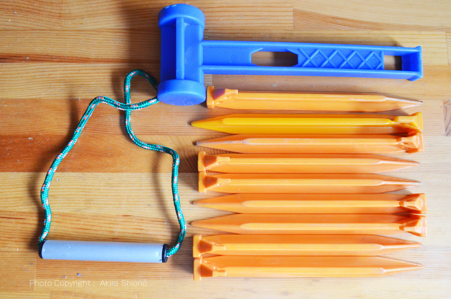 少し前のコールマンヘキサタープM付属のペグセットです。チープな感じがしますが非常に軽く出来ていて、芝や土に差込むのには大活躍します。土の地面の場合では足で体重を掛けて差し込んでも問題はありません。写真の内容は上から、プラスチックハンマー、プラスチックペグ、ペグ抜きです。タープ等の設置の時の必需品です。タープはこれを家に忘れて来ると、ちゃんとしたタープの設置は諦めるしかありません。使用後は土をキレイに落としてからバッグに必ず一緒に収納します。 オールマイティな金属製のペグ トップへ