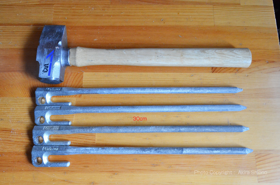 アウトドアを始めた頃には、公園などの許可されているバーベキューエリアの土や芝の地面でタープを張っていました。しかし夏場などは、河原などの水辺の小石まじりの地面にタープやテントを張る時があります。この場合付属のプラスチック製のペグですと全く地面に入っていきません。このような砂利、小石まじりの地面では金属製のペグが必要となってきます。 このような硬い地面にペグを打ち込むのには、重いハンマーが必要となります。私は利用頻度が多くないので、比較的低価格の450gのハツリ用のハンマーを使っています。本格的な物はSnowPeak製ですと4,000円以上しますが、ペグ抜きも付いているので頻度の多い方やアウトドア用品の好きなの方はそちらの方が便利と思います。ペグを抜くときはコードを外した後に、抜く作業をします。まず腰を落として別のペグをペグのをフック引っ掛けて両手で持って、立ち上がる動作をするとカンタンに抜くことができます。抜けないときは短く持つなどしてください。無理するとペグが曲がりますのでご注意ください。