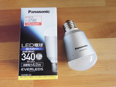 以前に電球型蛍光灯が発売された頃に省エネと夏場の発熱を避けるために白熱電球から、電球型蛍光灯に交換しました。その電球型蛍光灯は殆ど役目を終わりましたが、廊下にまだ一つ残っていました。この電球は、最高輝度になるまで時間がかかり点灯時には薄暗かったのでこの機会に購入しました。いままで広配光タイプはメーカー品ですとかなり高価でしたが、メーカー品でも最近価格が1,000円を切ってきました。 2011.12.23/直下型LED電球の使用感 トップへ