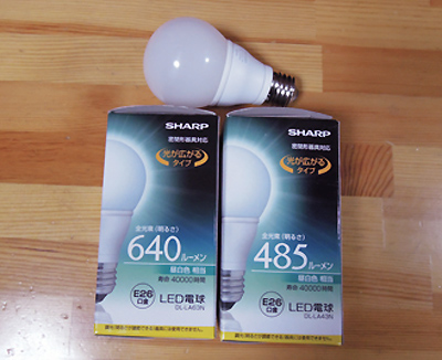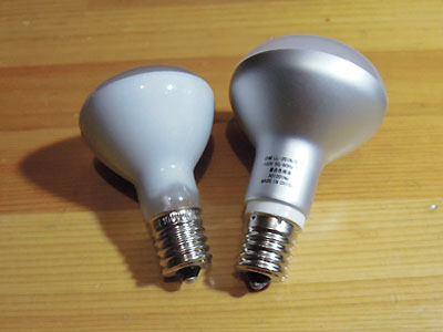 照明好きな私は、スポットライトもいくつか使っています。しかしここに使われている「レフ型」は小さい割に電気を喰います。写真の左側の17mm口金で25wで他に40wもあります。白熱球なので非常に高温になり、夏場は困った存在になります。しかし、写真右の「レフ型LED」は消費電力が3Wと省エネです。また、発熱も低く色温度も他のLEDと同じく昼光色に近くさわやかな色合いです(電球色もありました。)価格は1480円程度でした。昼白色のスポットもなかなか好感が持てます。 2011.6.21/LED電球も低価格で全方向型? トップへ