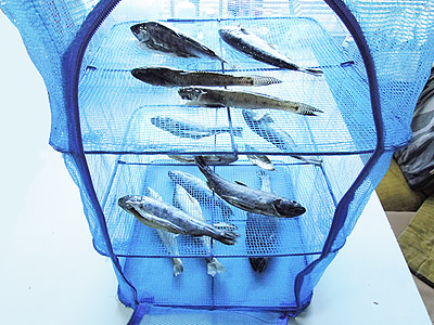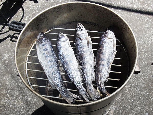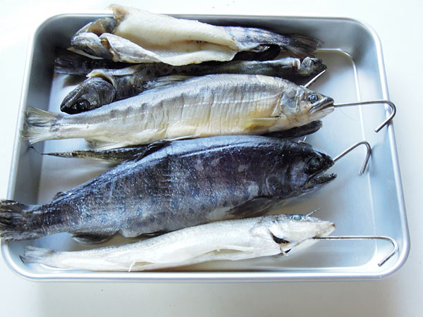 このたびの災害に伴い、幾らかでも省エネのお力になれることと、年間の電気代の節約の為に25年前の冷蔵庫を省エネ冷蔵庫の入れ替えることになりました。そこで冷凍庫を川や海で釣った魚が冷蔵庫を占領していたので、この在庫12尾すべてを一気に燻製することにしました。 燻製(くんせい)の下準備 トップへ 燻製は、そのままですとスモークの香りだけで味がつかないので、保存のための塩蔵や臭み抜きと味付けをの為にピックル液(ソミュール液)につけて下処理をします。
