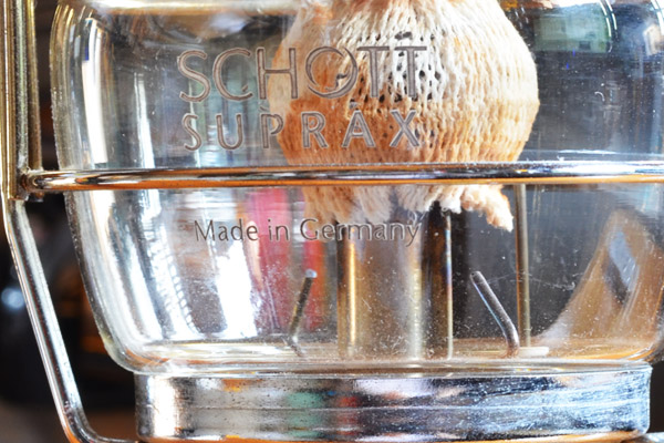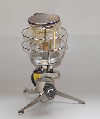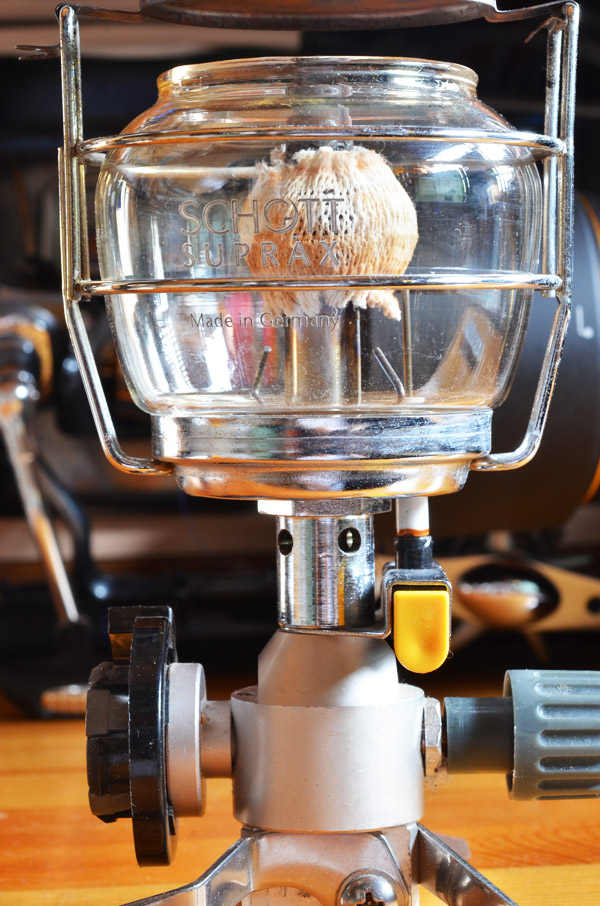 コールマンのランタンの中で一番明るいガソリン式のランタンです。底にはカードが付いていて、直接地面に置いても安定性があります。