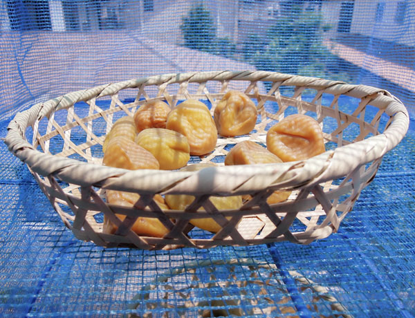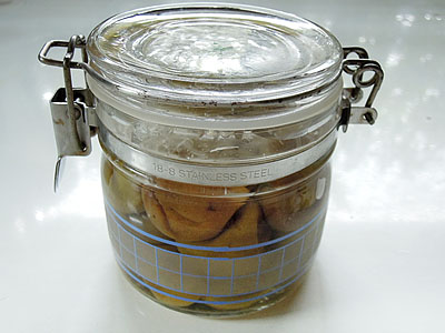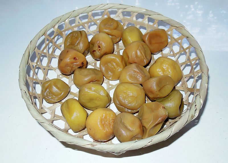 梅酢と梅の状態 トップへ H23年は7月9日に梅雨明けの発表がありました。さっそく手作りの梅干しを干す準備をします。カビなどのトラブルも全くなく運良くここまでこれました。梅を保存ビンから取り出して、いくつあるか数えて見えると、ちょうど20個。まぁちょっと楽しめる程度の数でした。あらしおを入れすぎた為に、梅酢は塩辛くて使い物にならないだろうとちょっと舐めてみると、・・・・途中塩を取り除いたのが良かったのか、なかなかの味!夏に塩気もあるので薄めてサワードリンクに使えそうです。